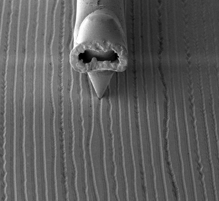 Игла проигрывателя под микроскопом выглядит внушительно. На деле ее размер — доли миллиметра, но в увеличении это уже «тяжелая техника», которая проходит по дорожке и считывает каждый изгиб.